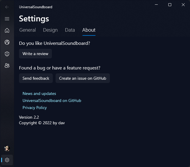 The Settings have a new page with the app info. There are also new buttons to write a review in the Microsoft Store and to directly send feedback using an online form.