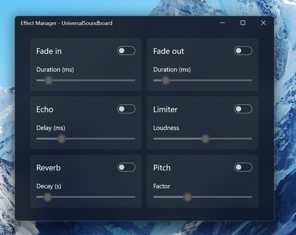 We understand that customization is key when it comes to creating the perfect auditory experience. Enter the Effect Manager, a simple tool that allows you to toggle global effects for all sounds in your soundboard. Whether you want a smooth fade-in, a gradual fade-out, or a creative pitch shift, the Effect Manager puts you in control.