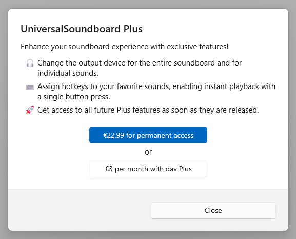 As you can see, you can now get access to UniversalSoundboard Plus with a one-time payment. This feature uses the Microsoft Store for the payment processing, so you don't need to log in with dav to get access to the additional features.