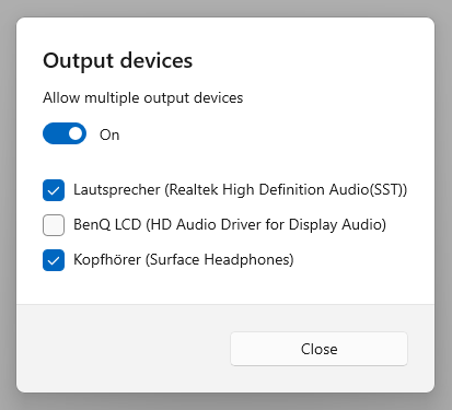 Here you can toggle between single or multiple output devices and select all the output devices where you want to play your sounds.
