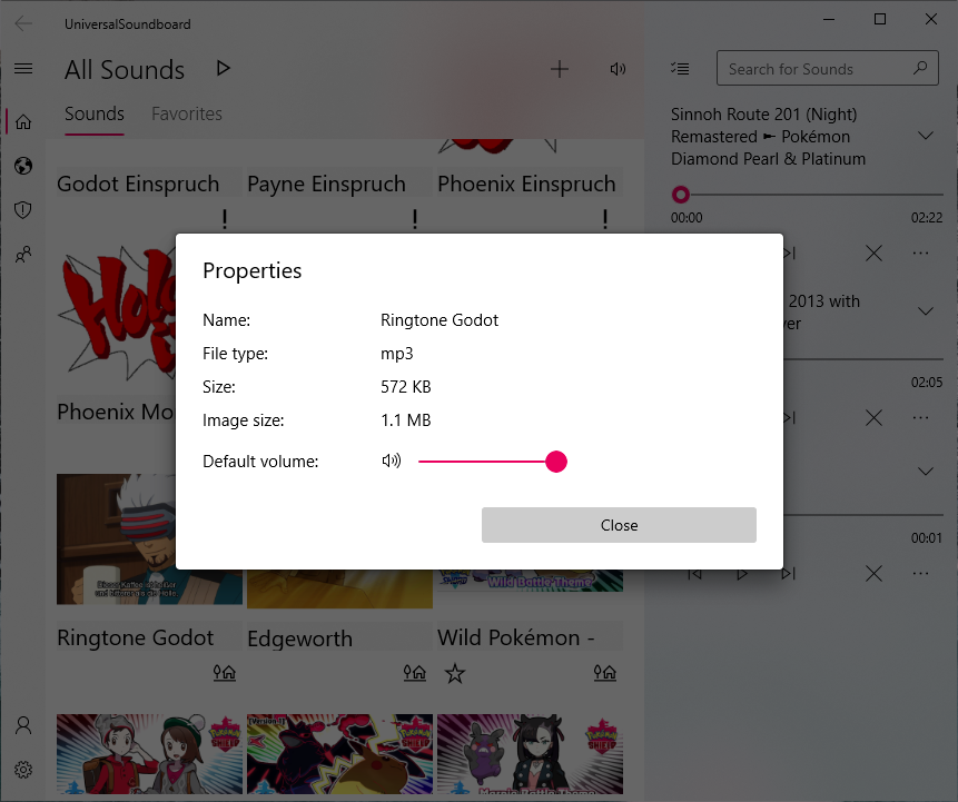 There is a new properties dialog for sounds, which shows all relevant information about the sound, like file extensions and file sizes. There is also a slider for setting the default volume. When you start a single sound, the sound will play with this volume.
